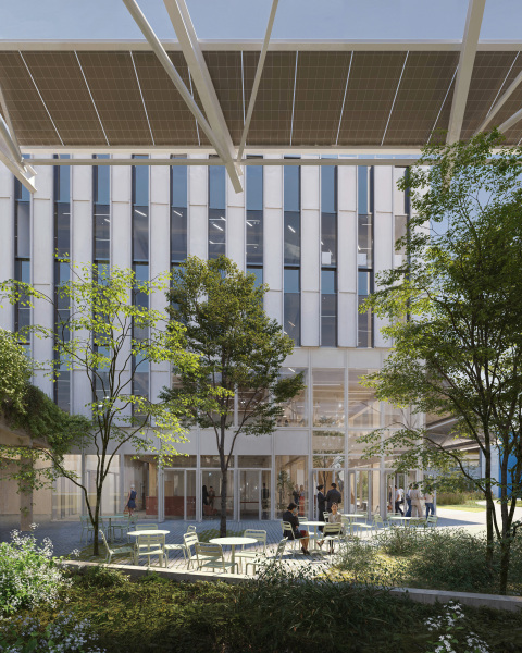 The lifespan of the buildings structure is longer than the lifespan of techniques and fixed furniture. Therefore, we emphasise the temporality of an interior for an office building by looking for the contrast in materiality. The entrance desk, storage cupboards and doors are finished in a wood veneer or wooden acoustic cladding. They are conceived as a 'soft' infill for the building.