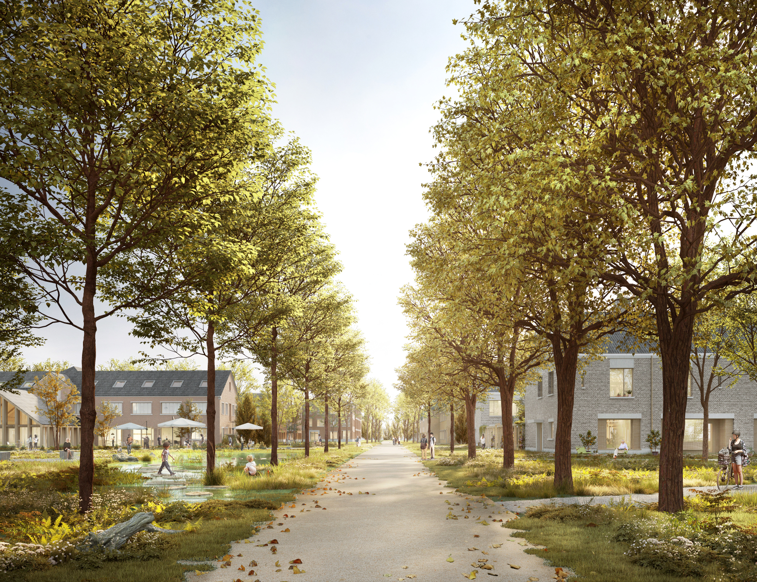 The location—between village core and landscape—defines the character of the plan. Public space, nature, and program are interwoven into a coherent whole, where a park with water features, newly planted woodland, play and sports areas, and a fine-grained network of walking and cycling paths form the connection between neighborhood, village, and forest.